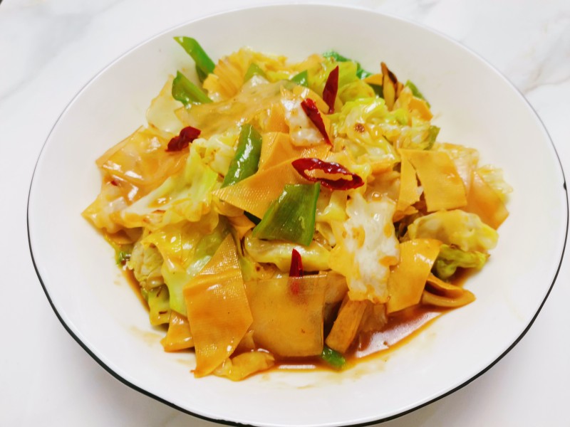 2:起锅烧油,油热倒入包菜煸炒至发软,加入干豆腐和青椒一起翻炒。