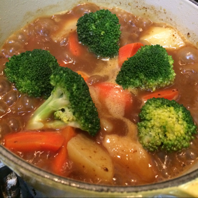 7:加入牛肉汤和咖喱,中小火炖制10分钟左右。