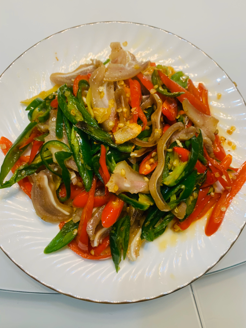猪耳朵200g;尖椒50g;葱5g;姜3g;蒜5g;