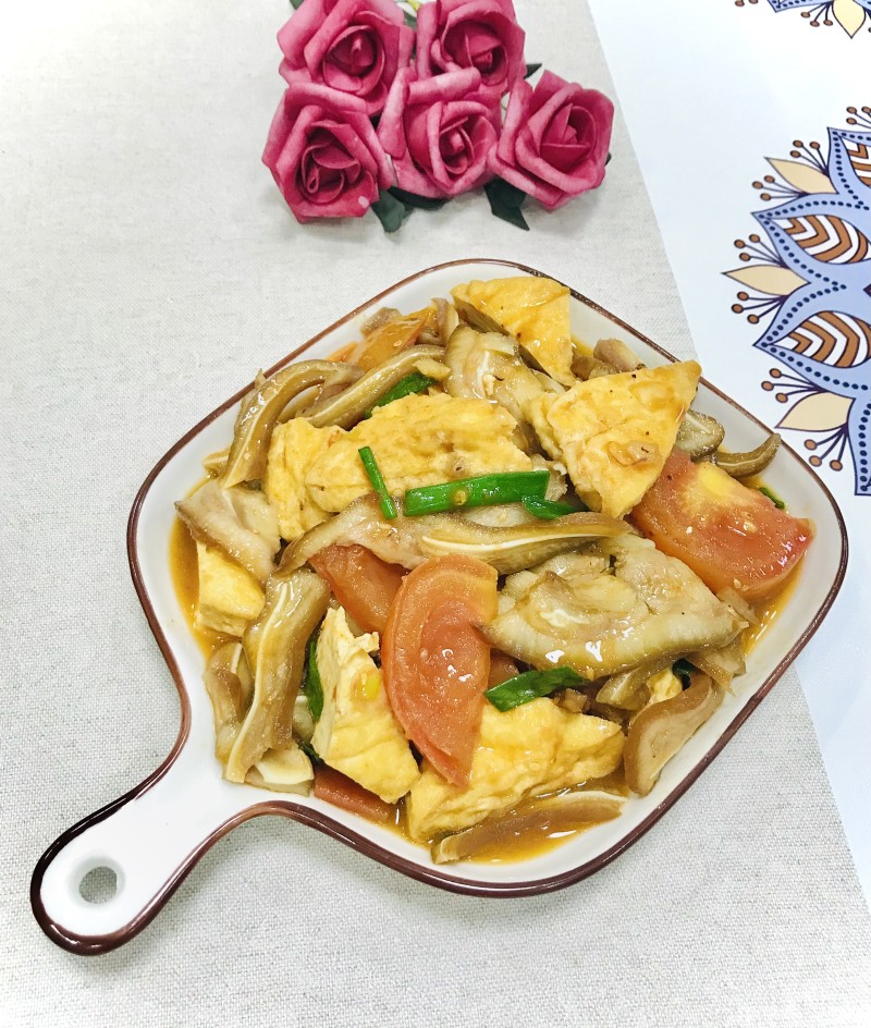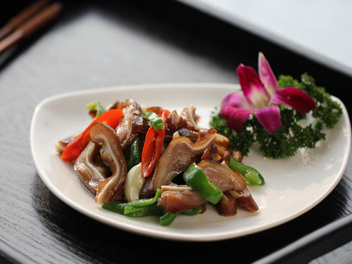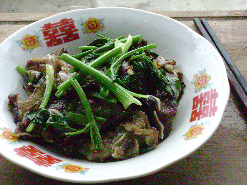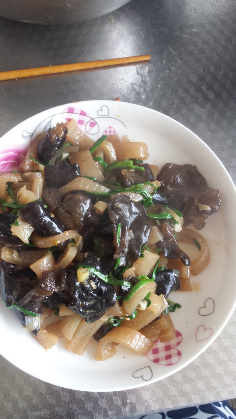 5:下猪皮,抄过水的木耳,翻炒,可以加少许水,翻炒,最后加蒜苗,翻炒出锅即可