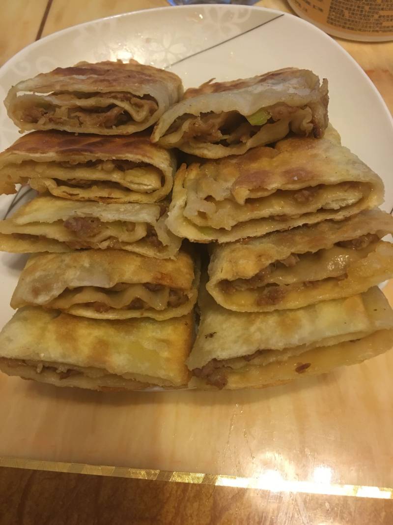 3:面擀长条,放入猪肉馅,然后卷起或者盘盘即