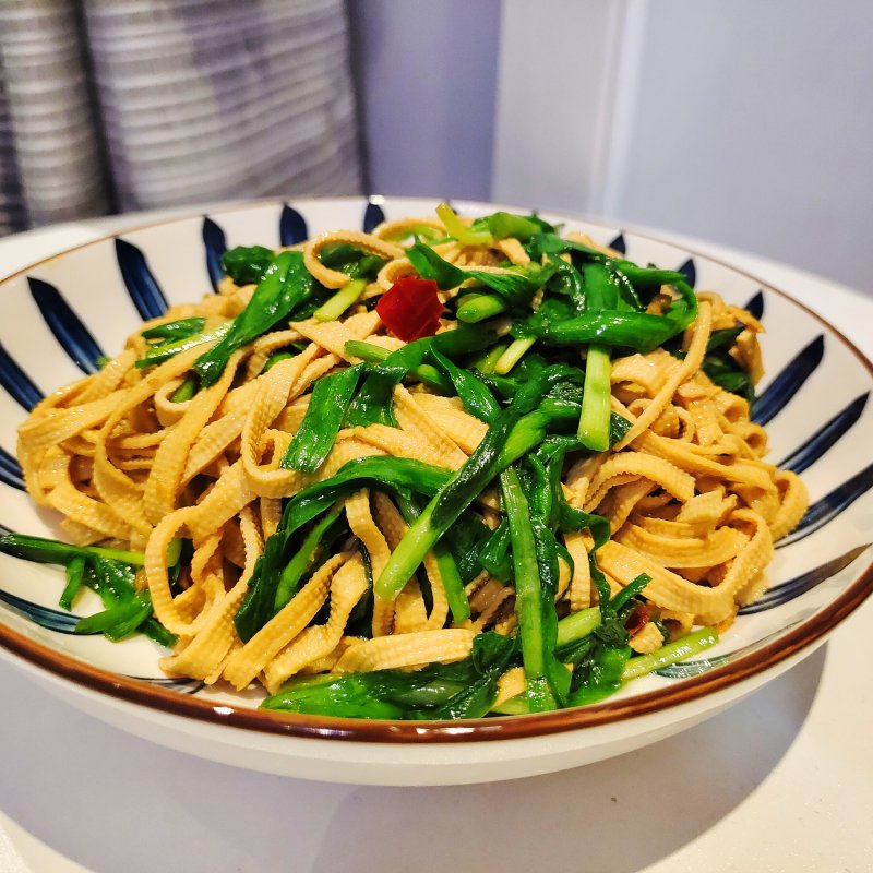 韭菜易熟且易出汤,所以要快炒,不要炒到完全熟便可出锅;豆腐皮是东北那边的非常薄的那种,而且筋道,如果用北方这种厚的豆腐丝,建议先入锅再放韭菜。