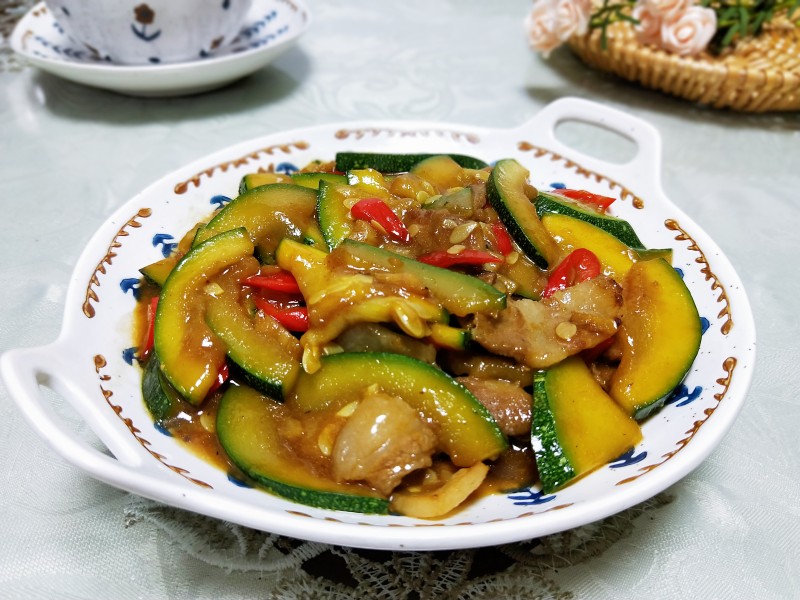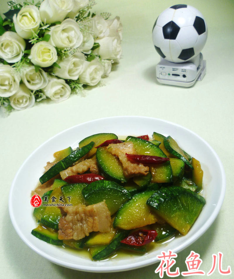 1:材料:嫩南瓜、五花肉(已切成片)、干辣椒(已剪开)