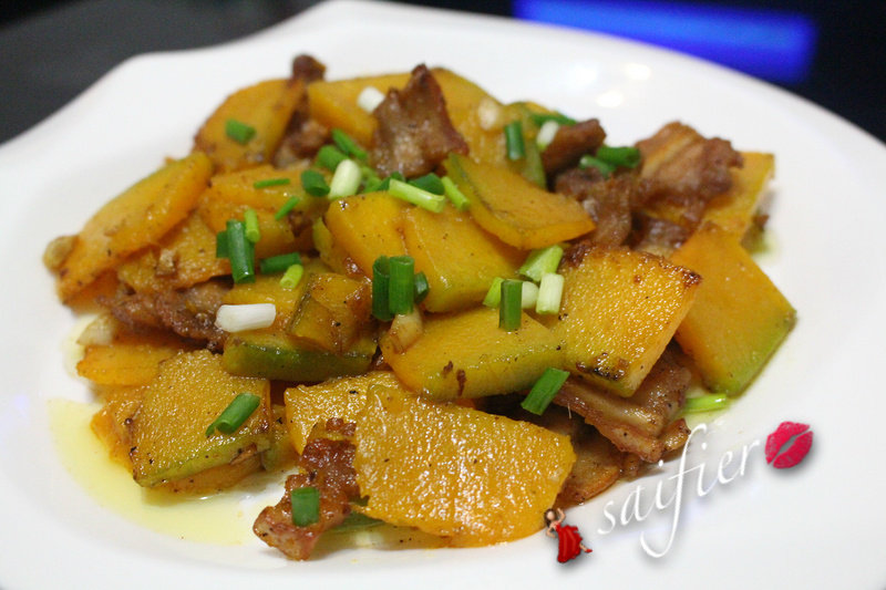 1:准备好食材。南瓜去皮切成片;五花肉切片