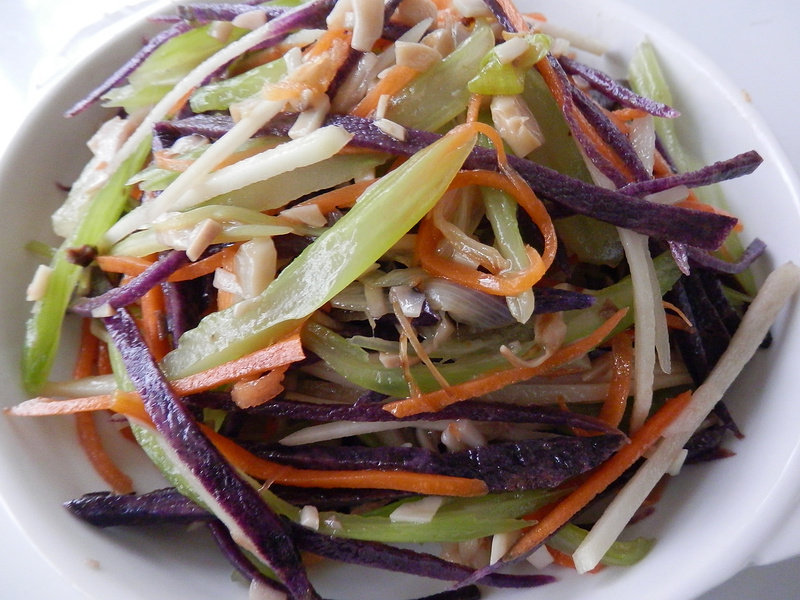 1:胡罗卜、黄土豆、紫土豆去皮,杏鲍菇、芹菜焯水