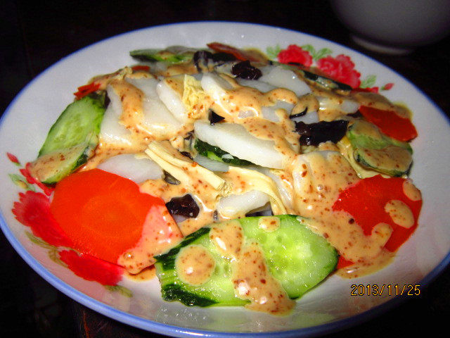 12:淋上丘比焙煎芝麻口味沙拉汁,即可食用。