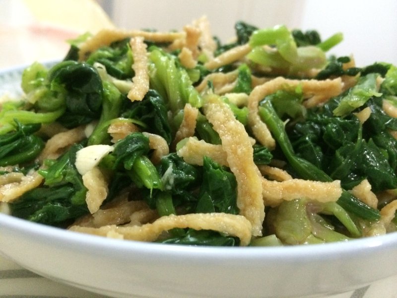 6:把馓子和菠菜装入盘中,并加入蒜末。