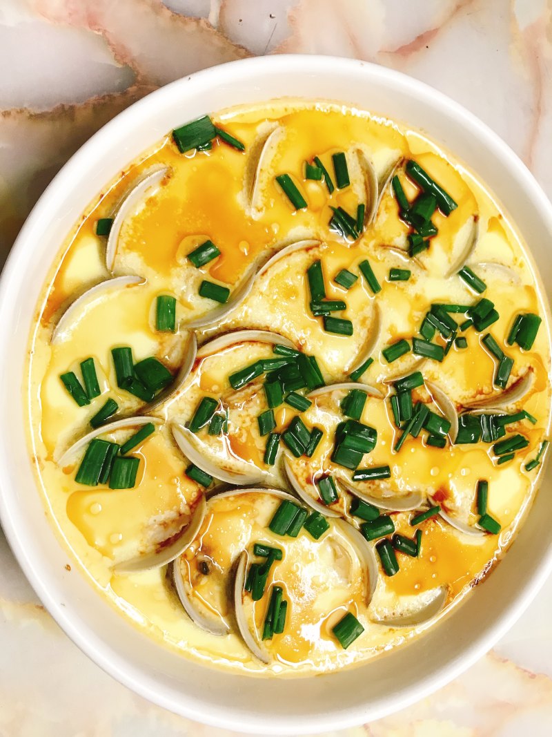 7:起锅淋一点食用油,和酱油,然后散上葱花,一道高颜值又鲜又嫩又滑的白贝蒸蛋就可以上桌啦~