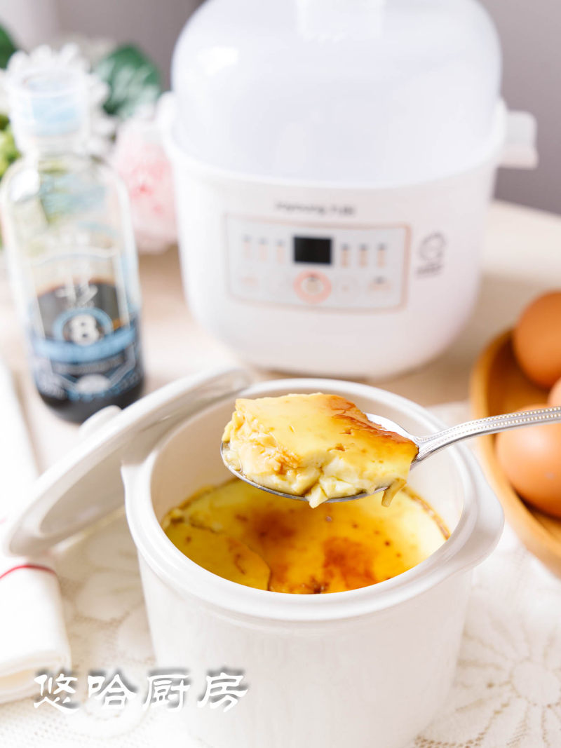 8:到时间后打开盖子,好鲜嫩的鸡蛋羹,淋上一勺轻盐原汁酱油就可以吃了,喜欢香油的可以放一丢丢香味提味。