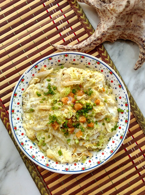1:用料:干贝15克,大白菜7片,鸡蛋1个,盐1/4小勺,胡椒粉适量,葱花少许