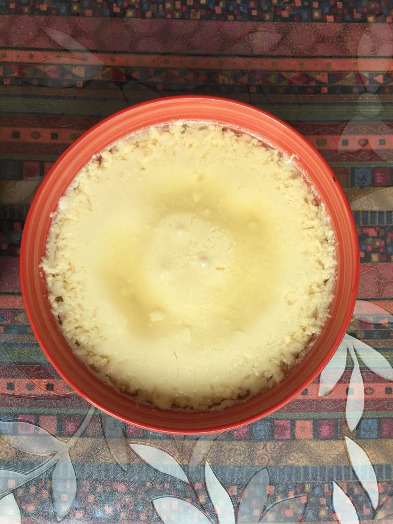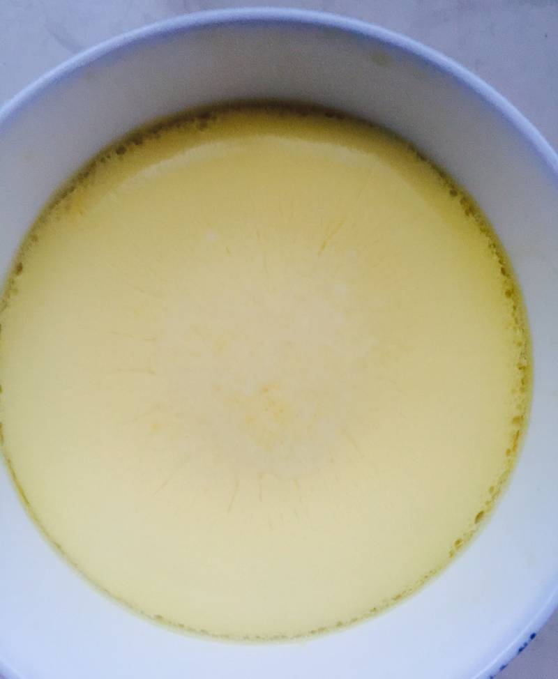 5:一个去壳鸡蛋52克搅散,加入40度温水52克。水和鸡蛋的比例是1:1。我做的是原味。喜欢甜食的也可以将水也可以换成牛奶,加点糖。