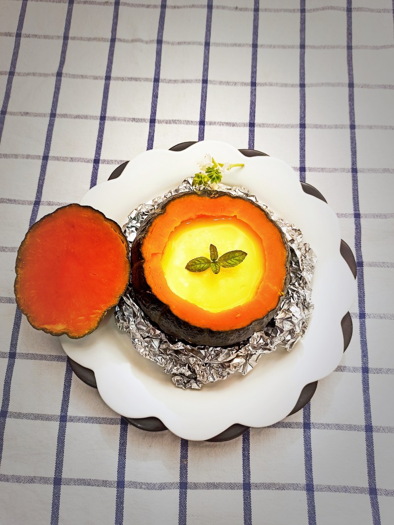 3:我准备用高压锅整,所以用一张铝箔纸包住挖去内芯的南瓜,防止蒸制过程变形。