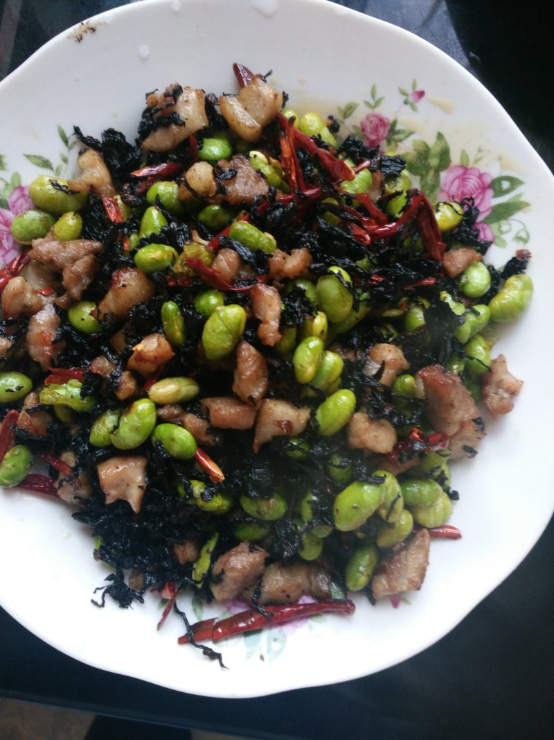 4:把肉放锅里炒然后把拨好的豆粒放锅里爆炒炒的差不多熟了把梅干菜放锅里炒一小会出锅