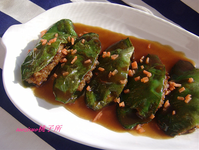 5:将塞好肉馅的扁豆角放油锅里炸至略上色取出;将剩油倒出,将扁豆角放回锅里,加入少许热水、蚝油、生抽炖煮片刻,将扁豆角码盘,剩余的汤汁勾薄芡汁,淋在扁豆角上,即可。