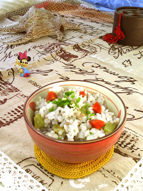 时蔬菜丁可以随自己喜好任意变化。加水量根据实际情况酌情添加。焖煮时保持中小火,以防底层焦糊而米粒不熟,出现夹生饭。
