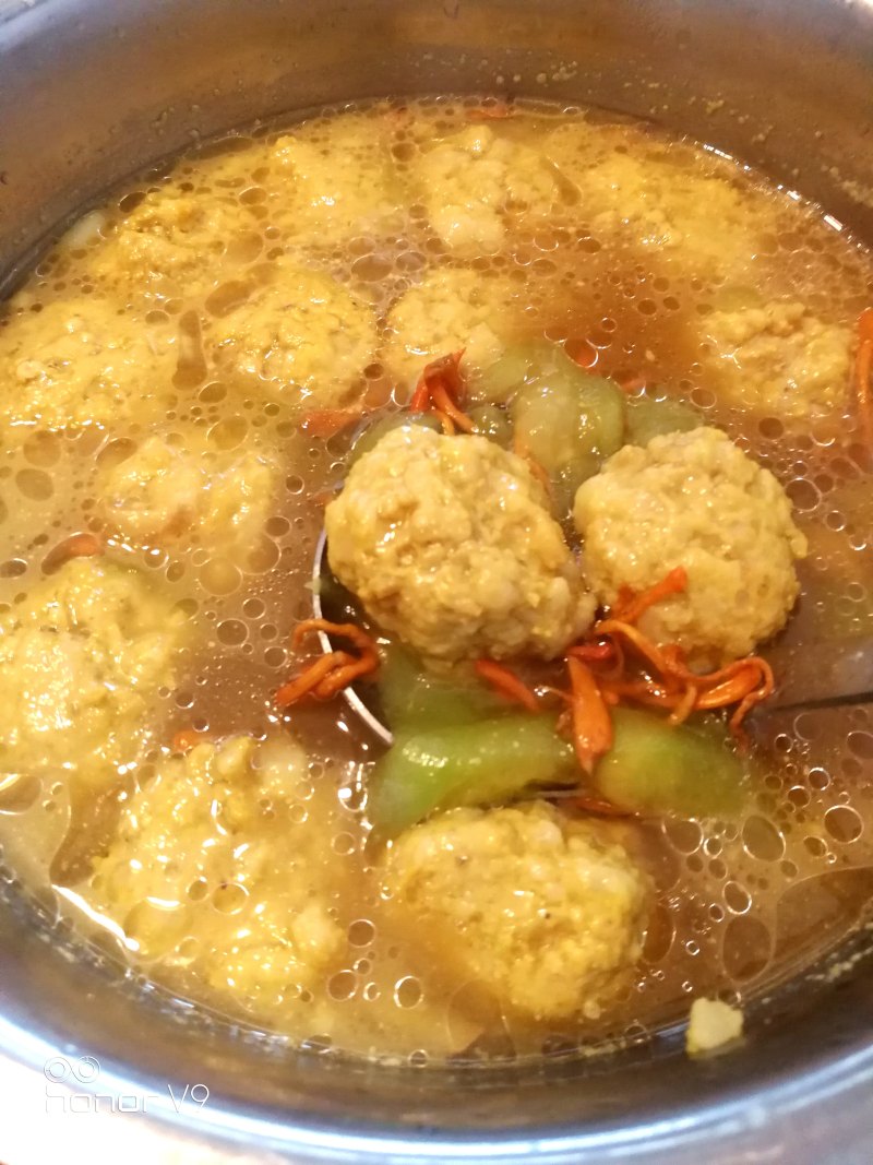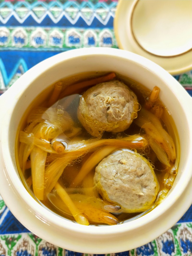 5:每个炖盅中加入2颗牛肉丸,这牛肉丸很鲜,放2颗就可以了。
