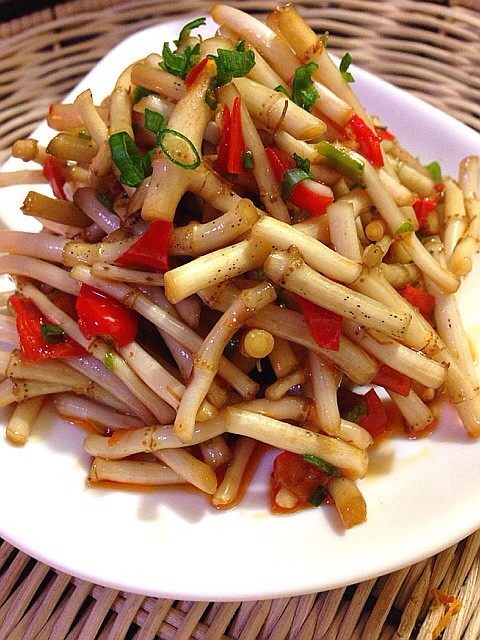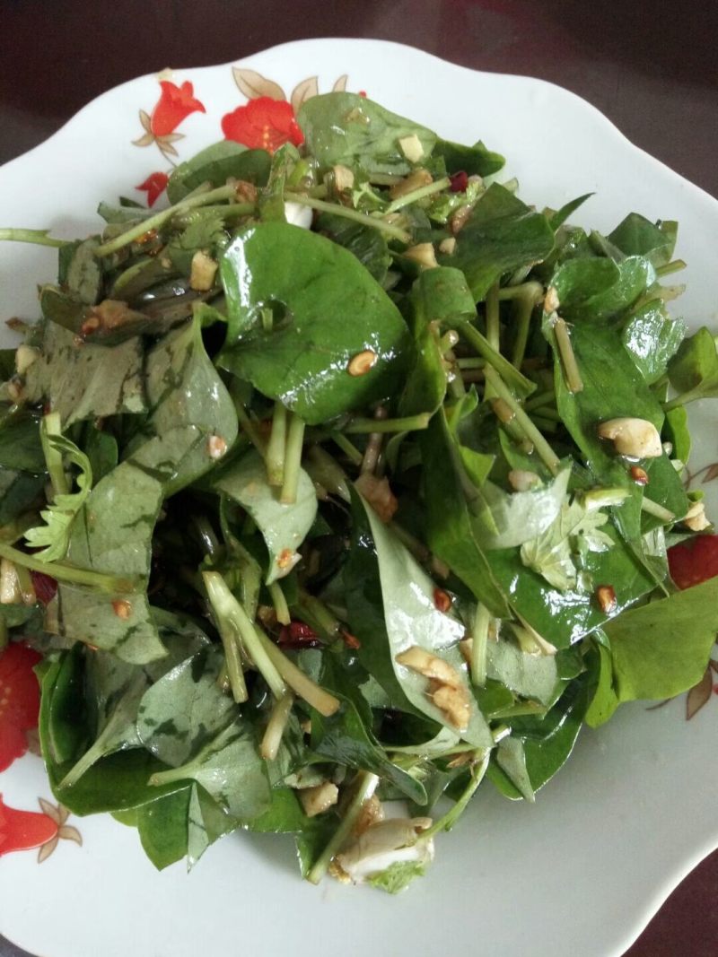 7:把拌好的根倒在叶子上,喜欢辣的可以放点辣椒油,不喜欢可以不放