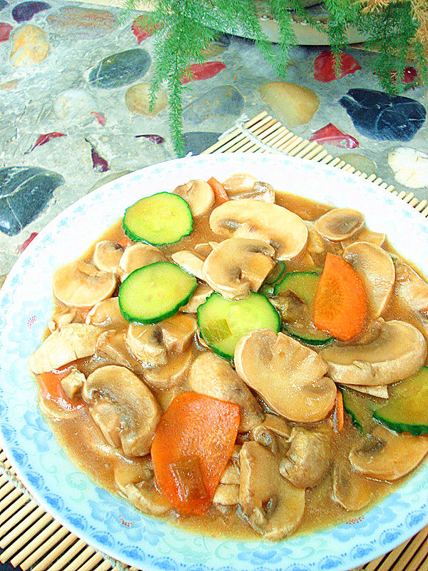 16:这道菜,制作容易,食材常见,口蘑鲜嫩,黄瓜爽脆,肉片滑嫩,咸鲜美味,营养丰富。