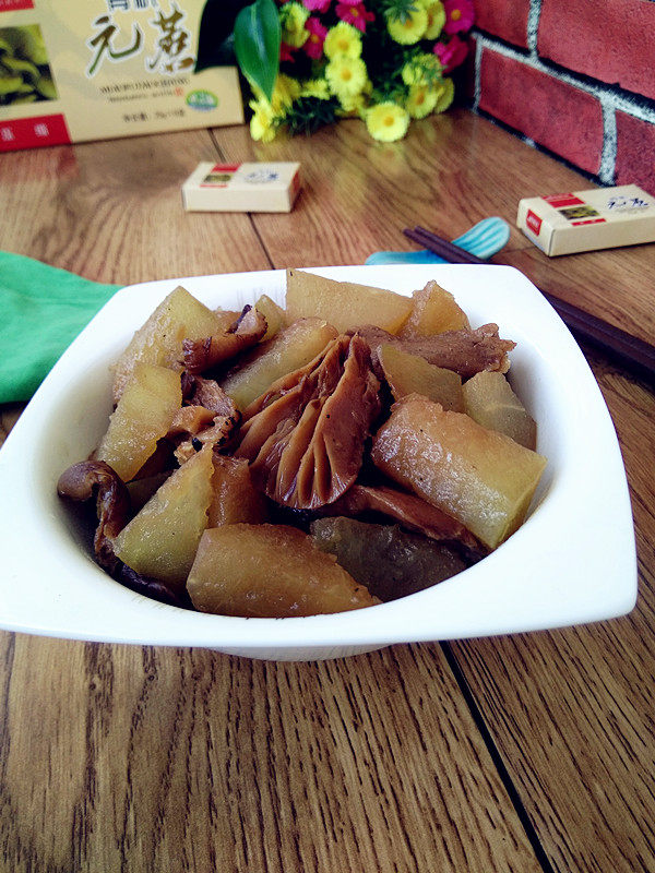 9:加适量浸泡榛蘑的水,盖上锅盖烩。其间适时翻炒。