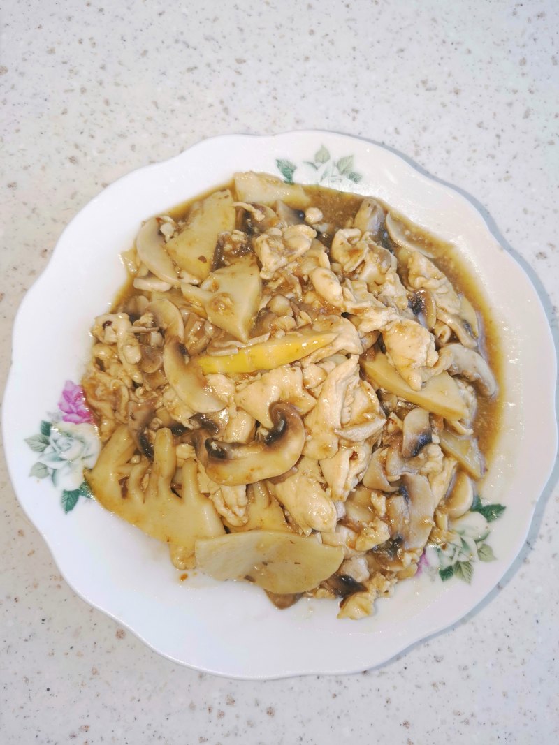 5:锅中放油,放冬笋,口蘑片煸炒断生,放炒好的鸡片,撒盐炒匀。