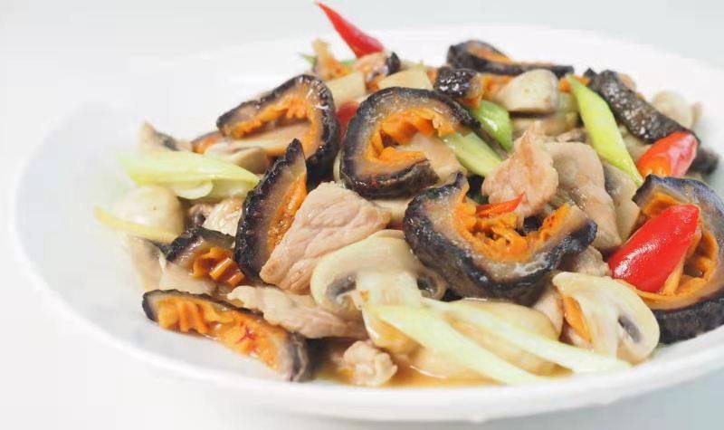 6:锅中放油,下蒜瓣,放入海参进行煸炒,加料酒,生抽。把腌制好的肉片倒入锅中,跟海参一起大火煸炒2分钟。