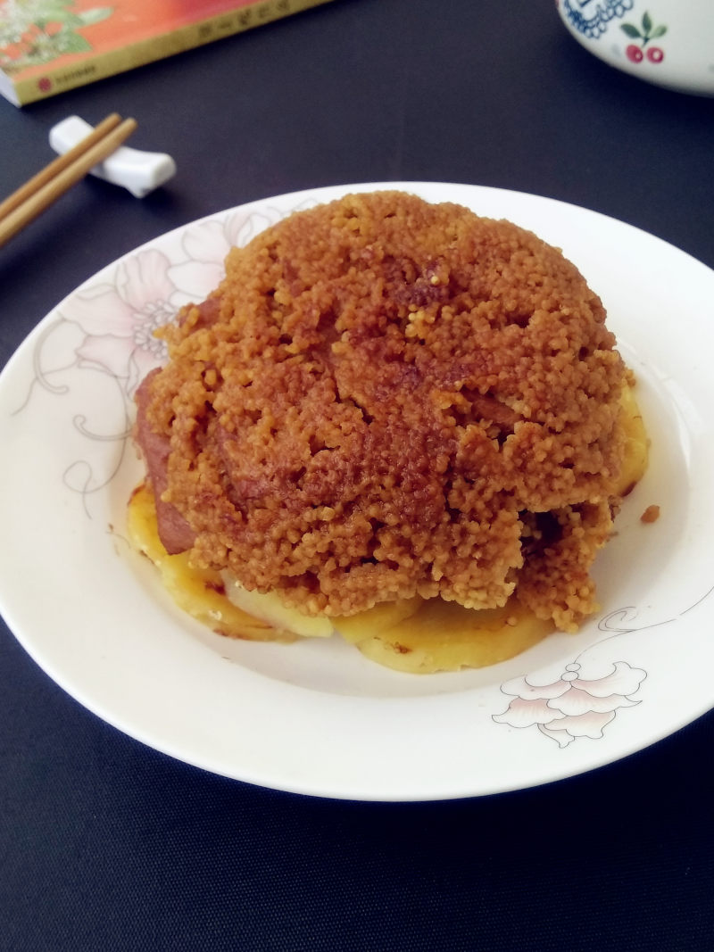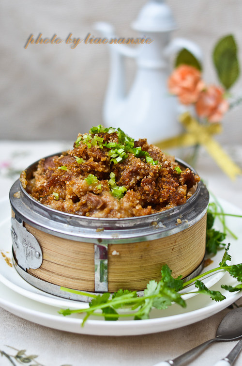 直接用小笼蒸肉,效果出奇的好,受热均匀,若不是上层淋下去水,蒸出来的肉松松散散,口感也很好。这一类的蒸菜,蒸好放凉再回锅蒸,吃起来会更滋润。我用的碎米,超市里有调好味儿的蒸肉米粉,用那个也很方便。
