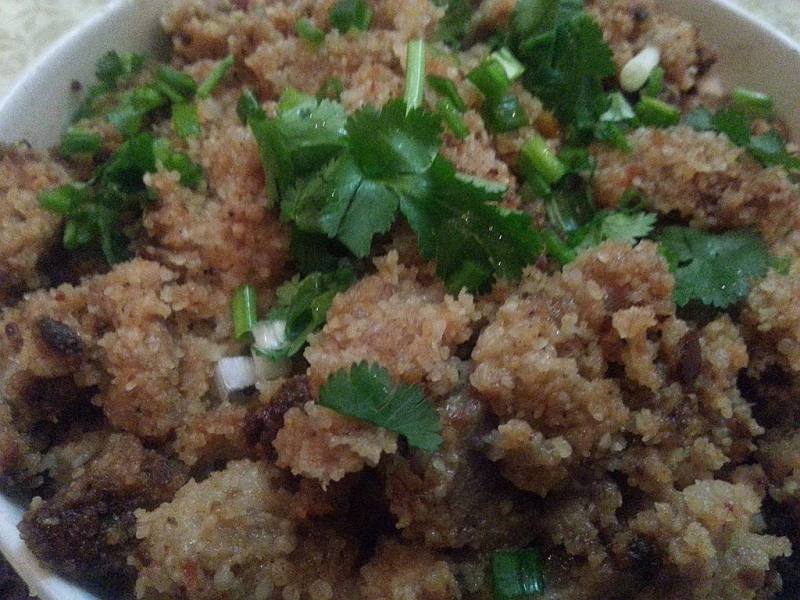 5:将炒好的米粉倒入腌好的肉注,抓拌均匀。