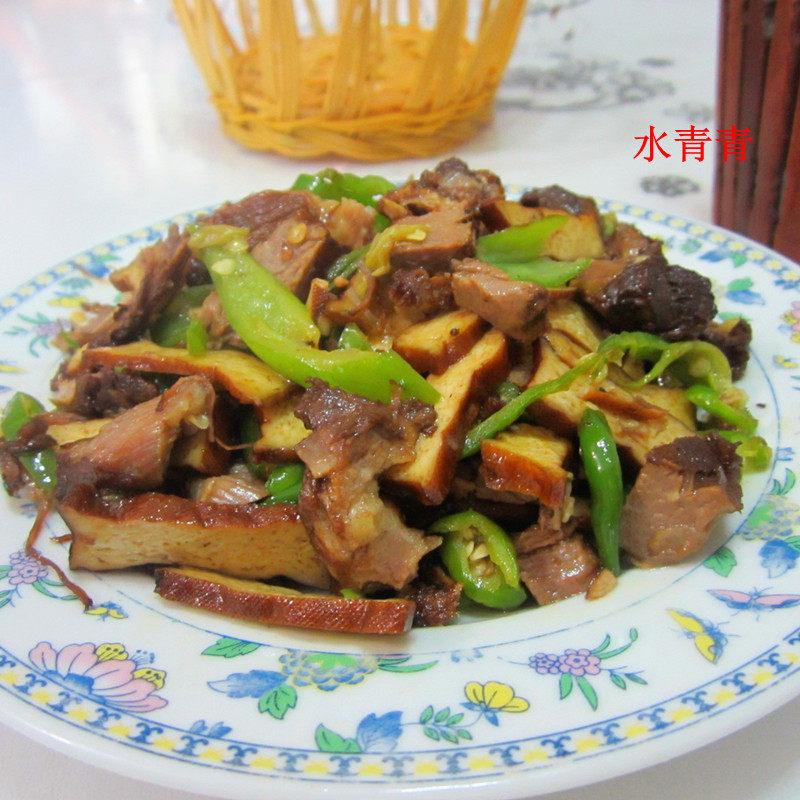 3:卤肉和卤香干切片,切点青椒丝和姜丝。
