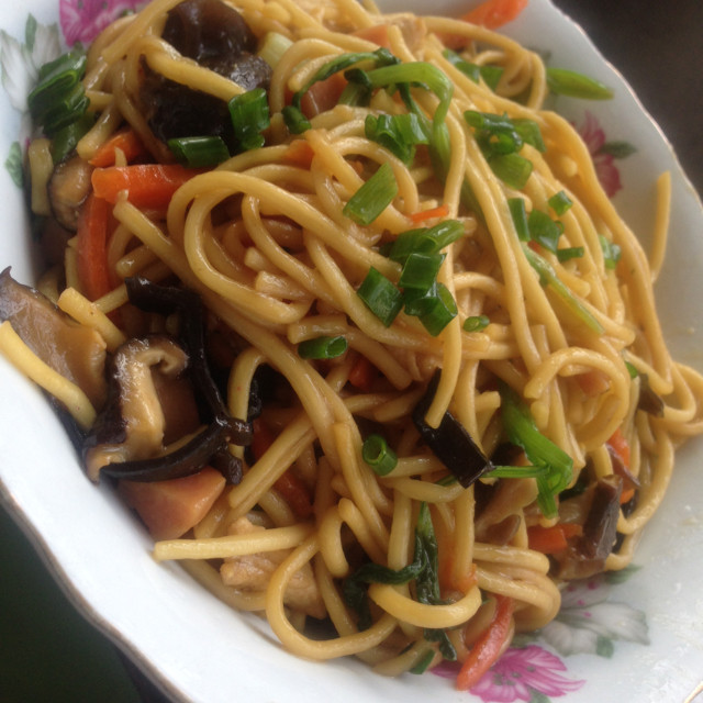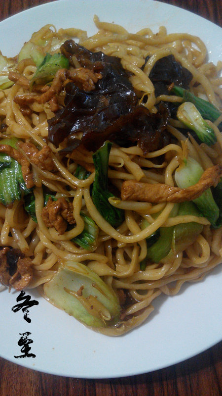 10:油锅炒瘦肉,变色后放入火腿丁以及所有的素菜进行翻炒,然后加入油面翻炒,微熟后加入酱油胡椒,些许的老酒,炒熟关火后加入味精
