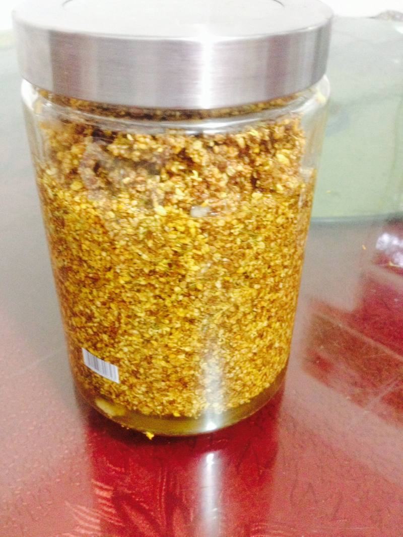 3:装入无水无油的瓶子再加入蜂蜜使桂花完全浸泡在蜂蜜中。