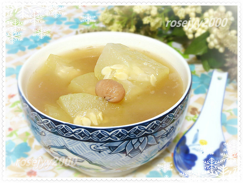 6:倒入冬瓜块、桂圆肉和陈皮,用煲粥档10分钟压就可以了,汤到喝时才酌情放适量盐。