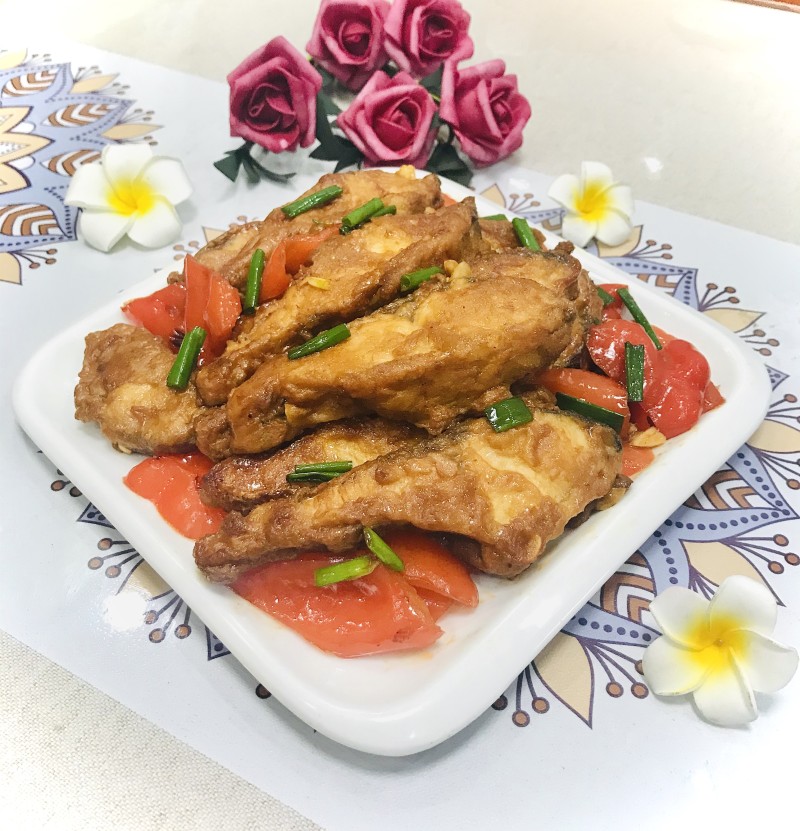 10:蕃茄酱加点生粉、清水勾芡,倒入鱼块。