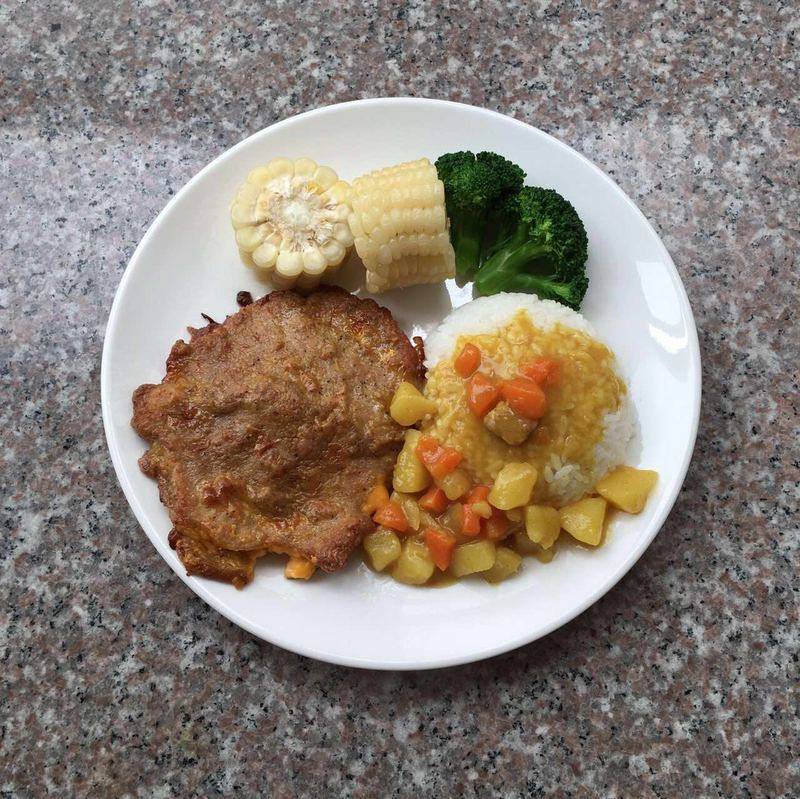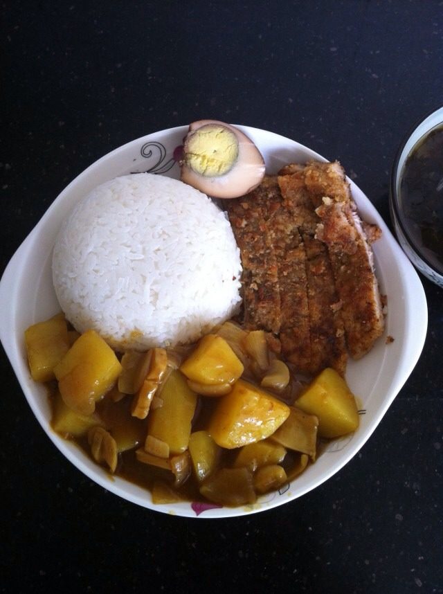 17:盘子里装上米饭,放入切好的猪排,煮好的咖喱,就完成了。(成品)