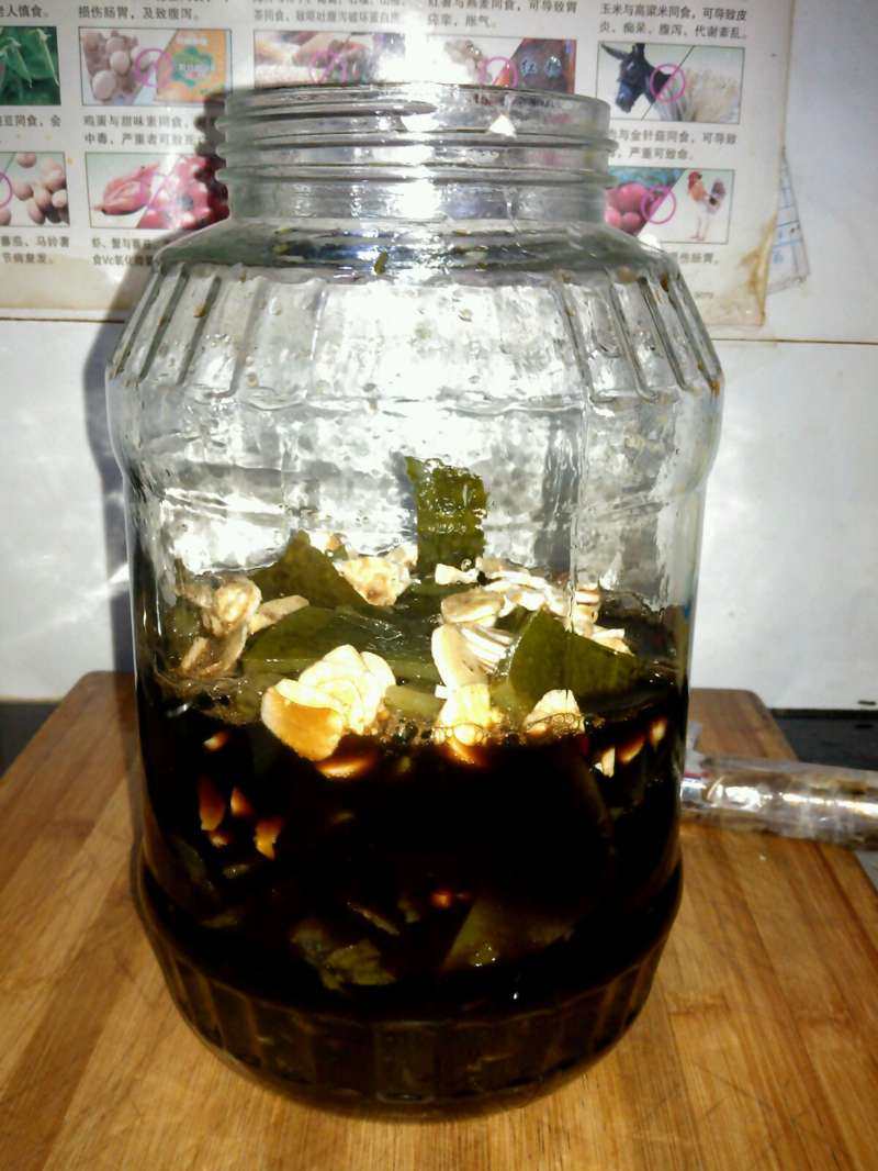 6:把海带控干水,倒进玻璃瓶里,然后把蒜片,精盐,味精,醋,加入罐子中。