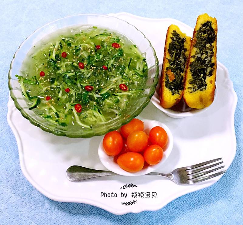 8:又煎至了芹菜叶苞米饼子和圣女果搭配海凉粉一起吃堪称完美