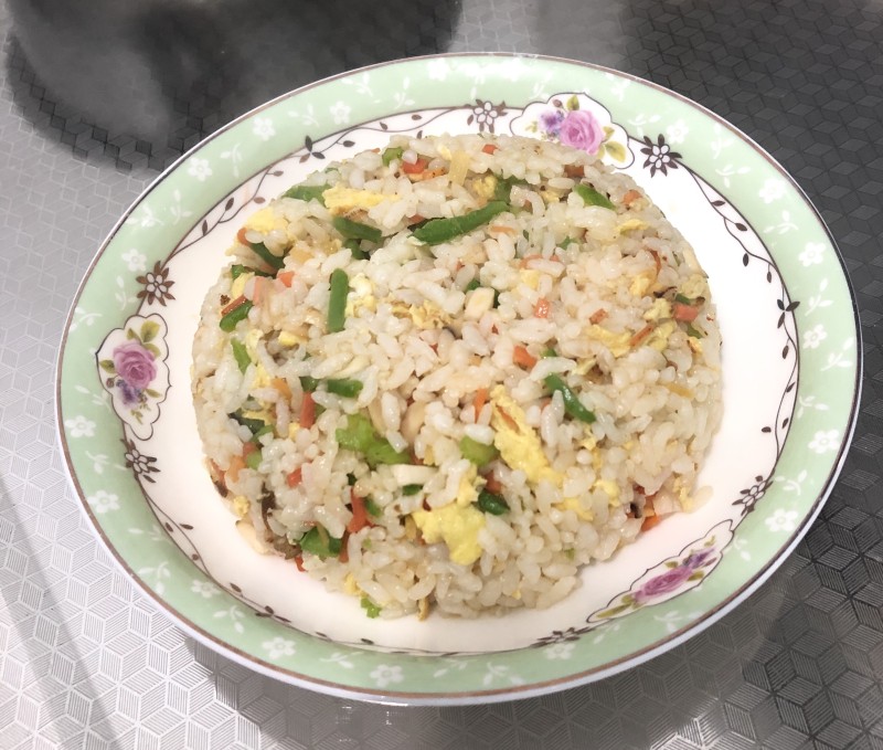 3:锅烧热,放凉油,下辅料翻炒,炒一分钟左右,倒入盘中待用,锅里放油,倒入米饭,翻炒成金黄色,在倒入辅料翻炒,然后装盘