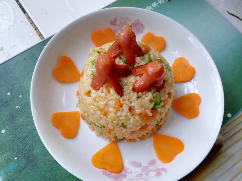 3:把饭装在小碗中,倒扣在盘子中,把微煎的BQ肠切十字,稍微用点力把肠固定在饭上,压出胡萝卜花心