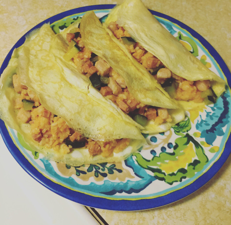 15:拿出一片鸡蛋皮,把炒好的饭铺在鸡蛋皮的一半,然后把另一半反过来盖住。又或者用鸡蛋皮把装好的饭完全包好也是可以的。包法有很多种弄自己喜欢的就可以啦~