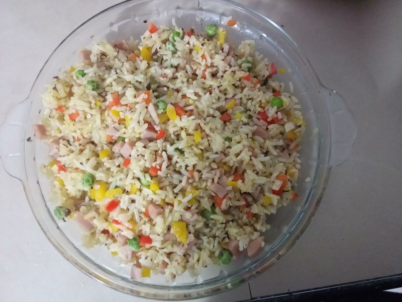 红黄甜椒适量;豌豆适量;火腿肠适量;鸡蛋适量;葱适量;