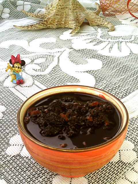 3:取一个平时煲汤用的泥砂锅,把滤过水的桑葚倒砂锅里,用勺子压一压,就可以看到桑葚汁出来了。