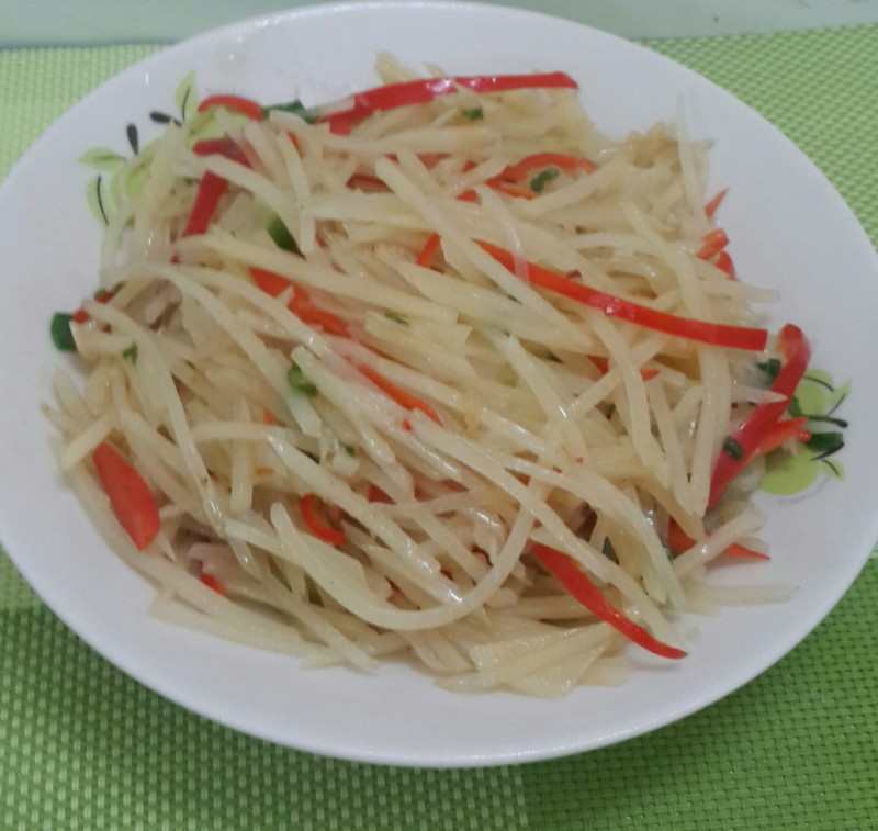 1.炒这个菜油温一定要高些,这样才叫炝炒,不然味道出不来2.炒土豆丝加醋是防止土豆丝炒软,所以只需加少量就可以3.这个菜可以适当放一些味精,因为口味确实比较淡,我一般是不放,不过有些味道比较单一而且比较素的菜偶尔会放一些,这个就是其一。4.做炝炒带辣椒的菜我喜欢用菜籽油,炒出来味道香