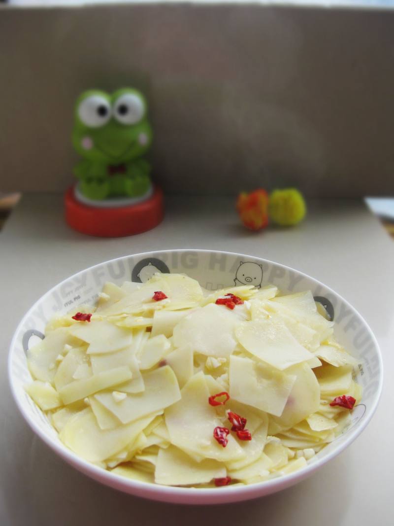 5:土豆切薄片,切下的土豆片泡在清水中,(原谅我的刀工吧,今天刚一拿刀食指不小心碰到刀刃,就是一深口子,严重影响切菜,痛死了)
