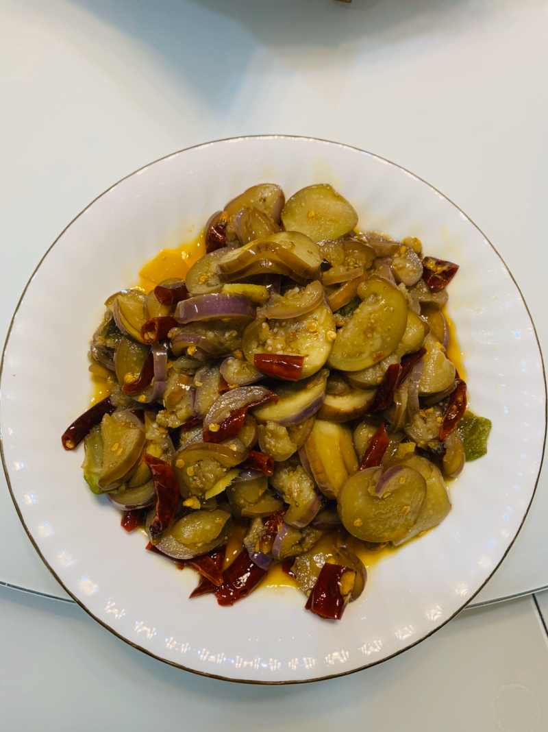 5:油五成热时,下大蒜头和干辣椒煸出香味。