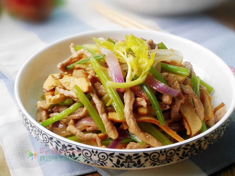 瘦肉150g;香干3片;芹菜2棵;洋葱1/4个;