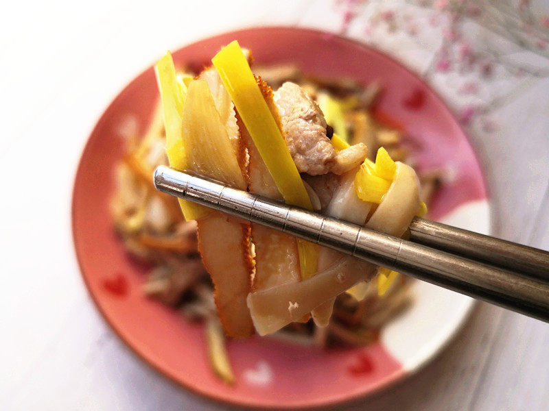 3:另起锅,重新放油准备炒猪肉,猪肉切丝,油热后下锅翻炒,当猪肉丝变色后倒入欣和酱油翻炒,用欣和酱油翻炒猪肉可以不放料酒,起到去腥提鲜的作用。