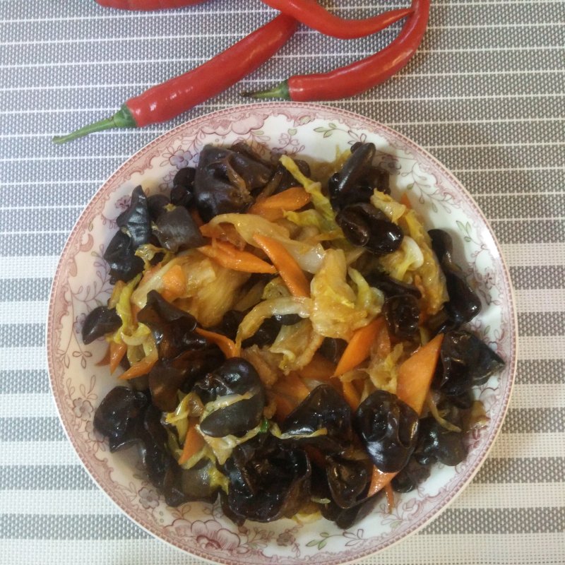 1:木耳提前泡发好焯水,白菜胡萝卜也切片备用