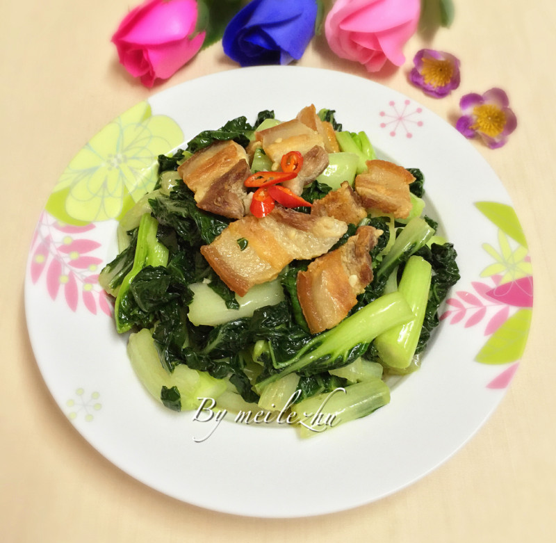 奶白菜400克;五花肉1段;蒜头2个;
