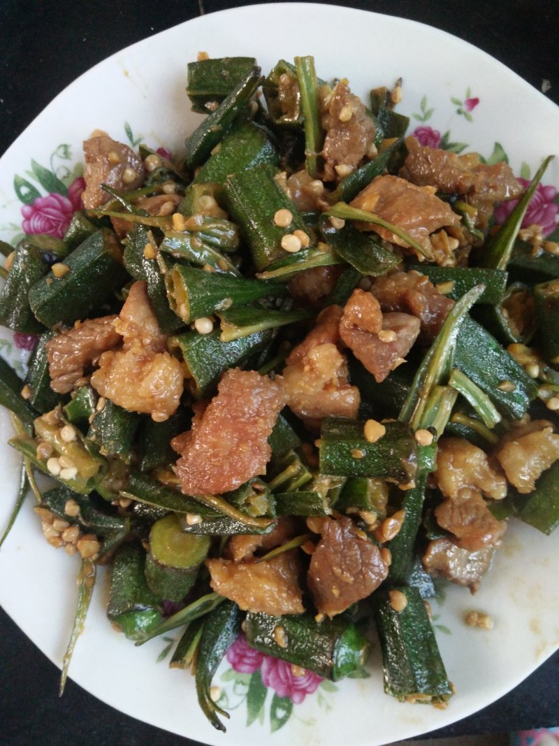 3:把肉炒的差不多,放秋葵,炒几分钟即可