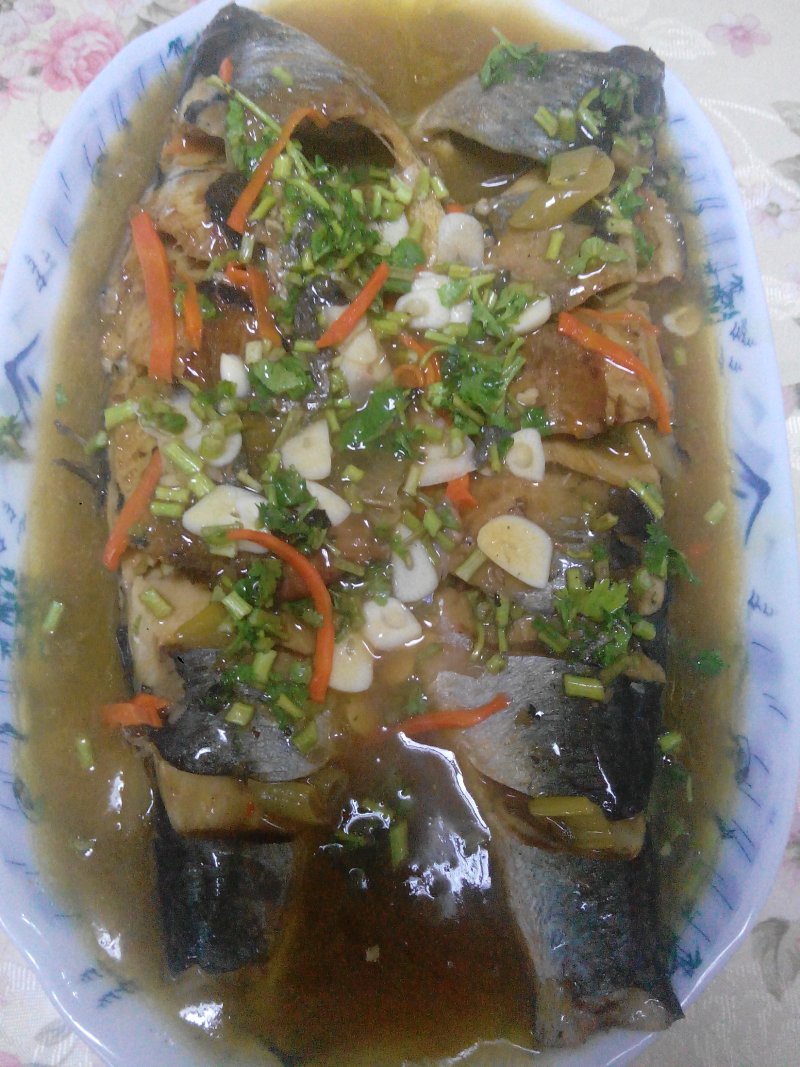 4:汤汁浓稠就可以出锅了,所有调料一定要提前放,鱼一碰就容易碎了,直接倒入盘中,就可以了,就爱这青鱼的海腥味儿。
