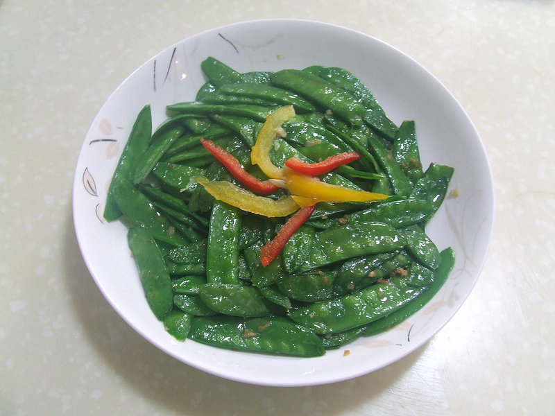 放点辣椒比较好吃。荷兰豆一定要摘掉老筋,否则影响口感。